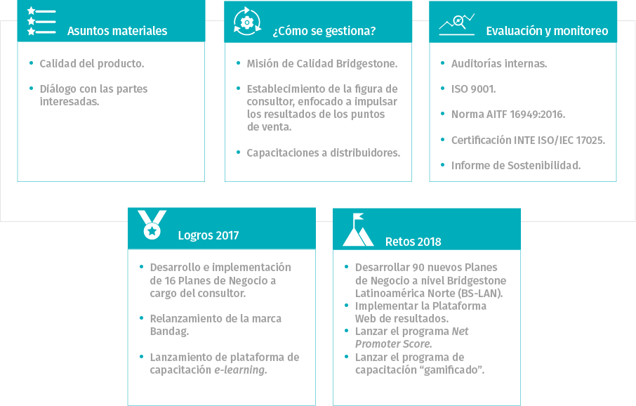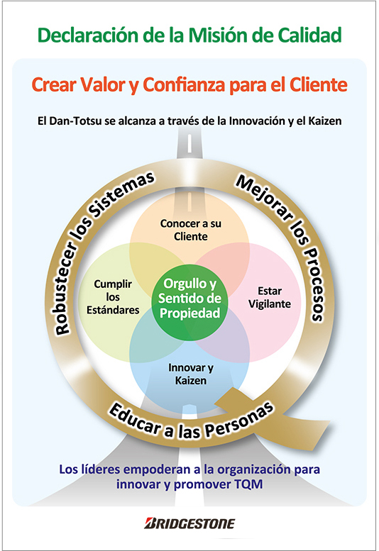 La Misión de Calidad de Bridgestone es una de sus señas de identidad, y por ello se enfoca de manera sostenida a mejorar sus procesos entregando productos y servicios de alta calidad en toda la cadena de valor. A través de la innovación constante consigue optimizar el desempeño y crear valor para los clientes en todos los aspectos del negocio.
