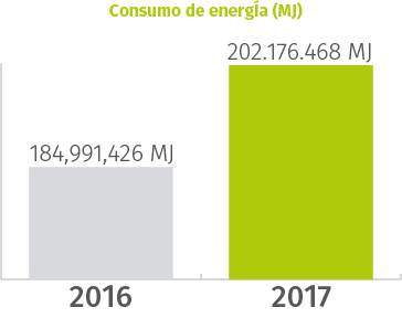 Bridgestone Costa Rica se esfuerza por mejorar la eficiencia energética de las operaciones en todos los niveles de negocio. Durante 2017 se consumió un total de 202.176.468 MJ de energía eléctrica. Se presentó un aumento del 9% (184,991,436 MJ) con respecto a 2016 debido a que el peso total producido de neumáticos creció de 37,474.54 toneladas en 2016 a 42,495.59 tonenalas en 2017, lo que requirió mayor consumo de energía eléctrica.