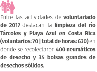 Aunque el número de participantes y horas de trabajo voluntario disminuyó frente a los resultados de 2016, el número de personas impactadas con el programa aumentó en un 300% aproximadamente, gracias a que se reforzaron los procesos de contabilización y validación de beneficiarios con las diferentes organizaciones que participaron o se aliaron con Bridgestone. Sin importar su clasificación, los programas de voluntariado en Bridgestone Costa Rica están alineados con las tres Áreas Prioritarias: Movilidad, Personas y Medio Ambiente.