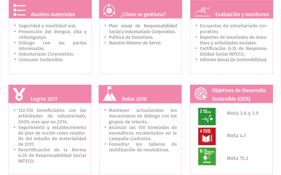 Con el fin de prevenir la propagación del dengue, zika y chikungunya, y a la vez contribuir al cuidado del medio ambiente, en 2017 se organizó un Llantatón que contó con la participación de 12 voluntarios Bridgestone, (horas de trabajo voluntario: 84) y se logró la recolección de 70 toneladas de neumáticos para su correcta disposición final.