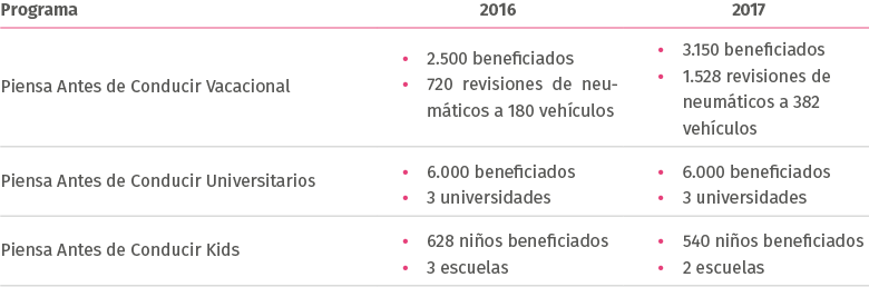 Dentro de las modalidades del programa están las siguientes: Piensa Antes de Conducir Universitarios, Piensa Antes de Conducir Kids y Piensa Antes de Conducir Vacacional (durante semana santa, vacaciones de mitad y fin de año). En total, estas tres modalidades impactaron positivamente a 9.690 beneficiados.
