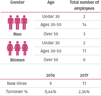 In 2017, the Bridgestone Colombia team had 32 members, 41% of which are women and the remaining 59% are men. The company hired 11 new employees over the course of the year, adding 4 women and 7 men to the workforce. The employee turnover rate stood at 2,34% per month.