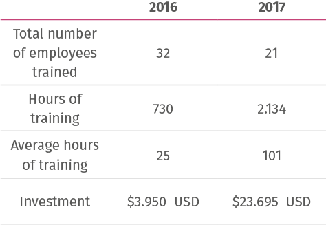 The company imparted a total of 2.134 hours of training, for an average of 101 hours per employee. Bridgestone Colombia invested USD 23.695 in training in 2017, representing a 500% growth over 2016.
