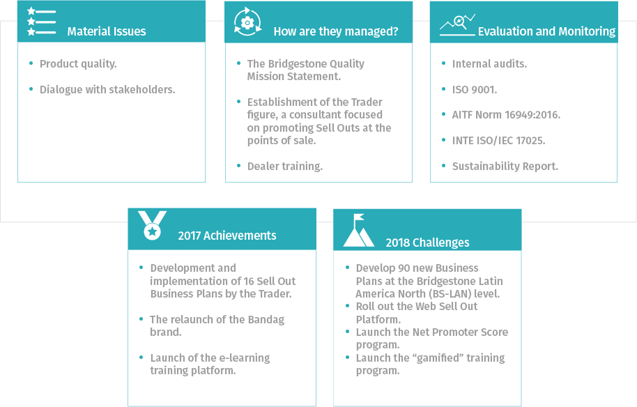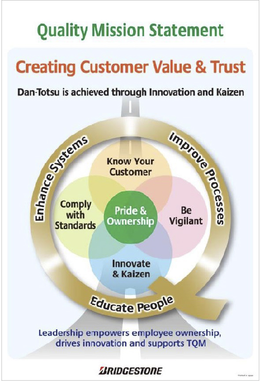 Through its Quality Mission Statement, Bridgestone focuses on improving its processes by offering superior quality products and services throughout its value chain. The company drives performance and generates value for its customers by promoting innovation in every single aspect of the business.