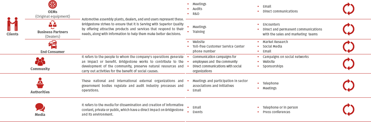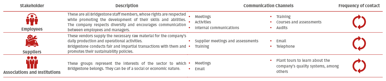 Bridgestone Costa Rica believes that the success of the business and its permanence depend on working together with its stakeholders, so it seeks to maintain constant communication, meet their expectations and establish partnerships that allow collaboration on topics of mutual interest.