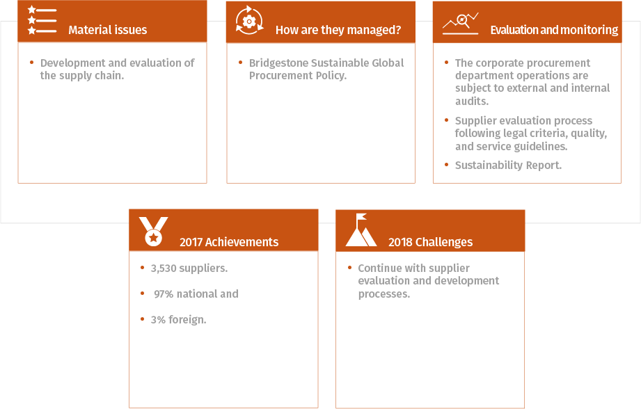 Bridgestone works with its suppliers on the creation of new opportunities to leave a positive footprint that not only raises the level of regulatory compliance, safety and quality, cost, and delivery, but also creates value for the entire supply chain through environmental best practices, respect for Human Rights, support for fair work practices, and transparency. With this, Bridgestone makes a positive contribution to the local communities touched by the supply chain.