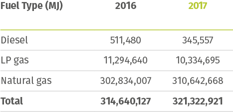 In 2017, the total consumption of these fuels was 321,322,921 MJ, with a 32.4% reduction in the use of diesel and a 2.6% increase in the use of natural gas compared to 2016. .
