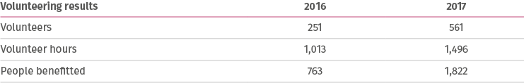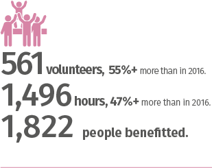 In 2017, the total number of volunteers stood at 561 with 1,496 volunteered hours, achieving a positive impact on 1,822 people benefited. Regardless of their classification, the volunteer programs at Bridgestone Mexico are aligned with the three Priority Areas: Mobility, People, and Environment.