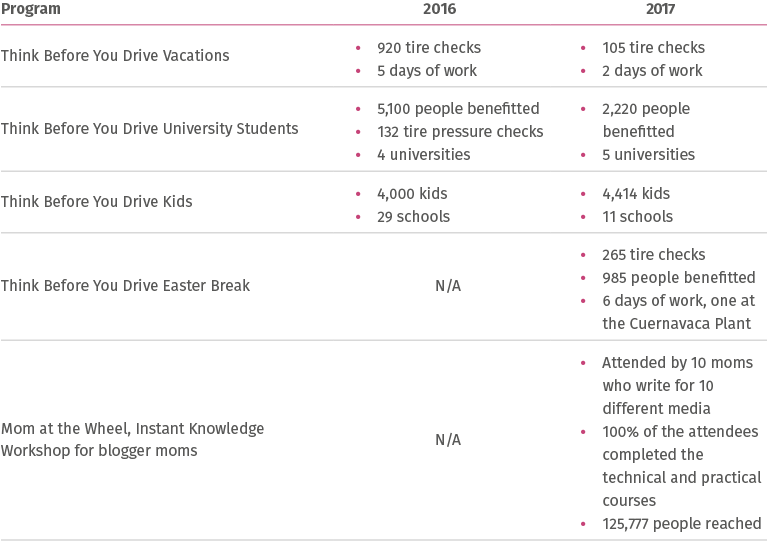 Bridgestone Mexico, through its programs of road safety, contributes to the achievement of the SDG 3, Target 3.6: By 2020, halve the number of global deaths and injuries from road traffic accidents.