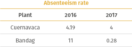 Cuernavaca plant reported 20 accidents in 2017,one less than in 2016.The rate of working lost days was 27.51 for men and 0 for women. Absenteeism was reported at 4%, which is 5% lower than the rate reported in 2016.