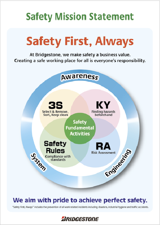 The Bridgestone Safety Mission seeks to promote the health and safety of all employees, complying with the law and with the bylaws established for each workplace.
