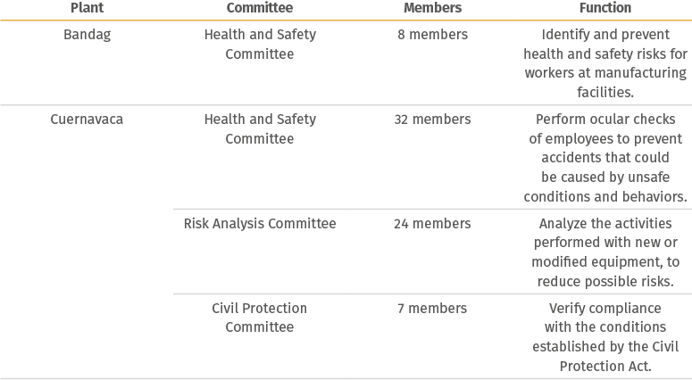 The existence of occupational health and safety committees is considered a key management mechanism for these issues that are fundamental to Bridgestone Mexico.