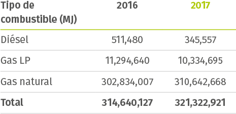 Durante 2017 el consumo total de estos combustibles fue de 321,322,921 MJ, considerando una reducción de diésel del 32.4% y un incremento del 2.6% de gas natural frente a 2016 .