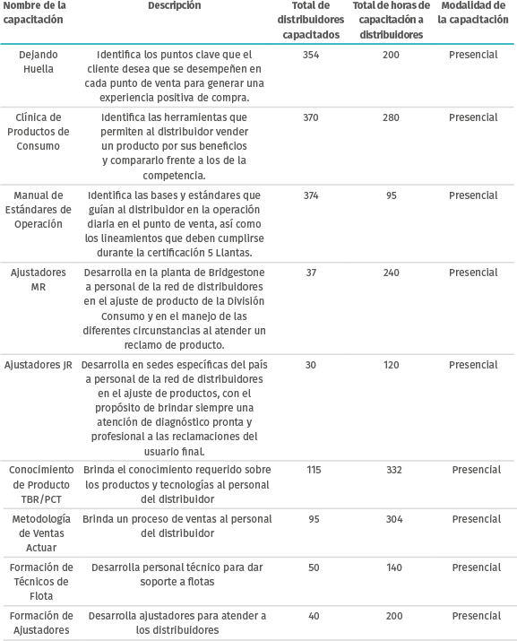 Además de los cursos de formación, Bridgestone cuenta con la Escuela de Negocios Bridgestone que funciona como un organismo de capacitación especializada para distribuidores. Está alineada a la filosofía de la empresa, cuyos pilares son la calidad, la creatividad y la innovación, a fin de generar valor y crecimiento profesional.