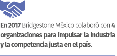 Bridgestone México se considera a sí mismo un impulsor de la libre competencia y el sano desarrollo de la industria en el país. Para actuar en congruencia, participa en eventos e iniciativas que promueven dichos objetivos, sumándose a alianzas y colaboraciones que favorecen contribuciones más eficientes y certeras.