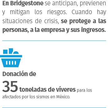 Además, debido a los grandes estragos en la comunidad inmediata a Bridgestone México, los colaboradores recolectaron un total de 100 kg de víveres y 89,000 pesos que se donaron, al igual que 300 impermeables para los voluntarios, a través de la Cruz Roja. En el caso de Morelos, se levantó un censo para detectar a los colaboradores que sufrieron daños graves en sus viviendas y se instrumentaron monederos electrónicos para apoyarles.