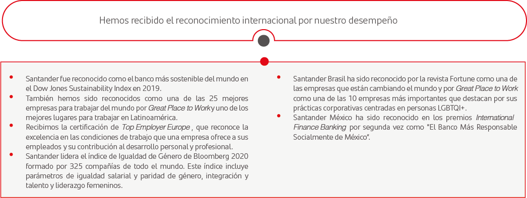 La Política Corporativa de Cultura ha incorporado la Política de Voluntariado. También hemos actualizado nuestros principios de Diversidad e Inclusión para reflejar nuestro compromiso con las personas con discapacidad y las personas con diferentes orientaciones sexuales; y para destacar la importancia de tener productos apropiados y accesibles para todos. Asimismo, nuestros compromisos de liderazgo se han incorporado dentro de los estándares mínimos que conforman Santander Way.