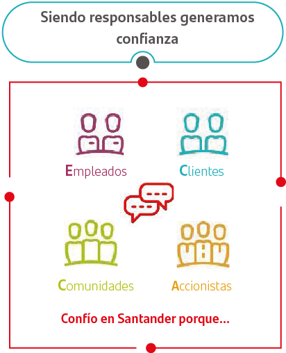 La confianza de las personas es clave para crear valor a largo plazo. Para ello, promovemos la escucha activa con todos nuestros grupos de interés. Escuchando, analizando, y dando respuesta a sus opiniones e inquietudes no solo identificamos problemas, también detectamos oportunidades, lo que nos permite garantizar el éxito de nuestra actividad como banco y mantener el correcto funcionamiento de la cadena de valor.