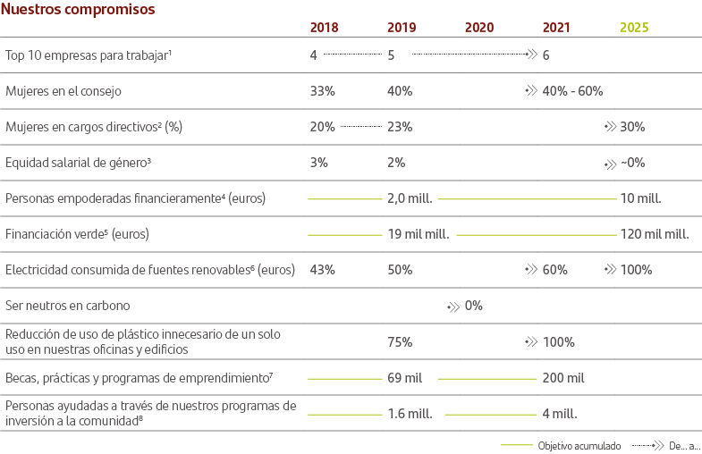 Estamos trabajando en tener una cultura sólida: contar con un equipo comprometido, diverso y capacitado que ofrezca a nuestros clientes soluciones a sus necesidades aumentando el acceso a servicios financieros; mejorando la educación y formación financiera; apoyando a nuestros clientes en su transición hacia una economía verde, y reduciendo nuestra huella medioambiental. Además, seguimos aumentando las oportunidades con el apoyo a la educación de nuestro programa de Universidades y mejorando las condiciones de vida de las comunidades en las que operamos.
