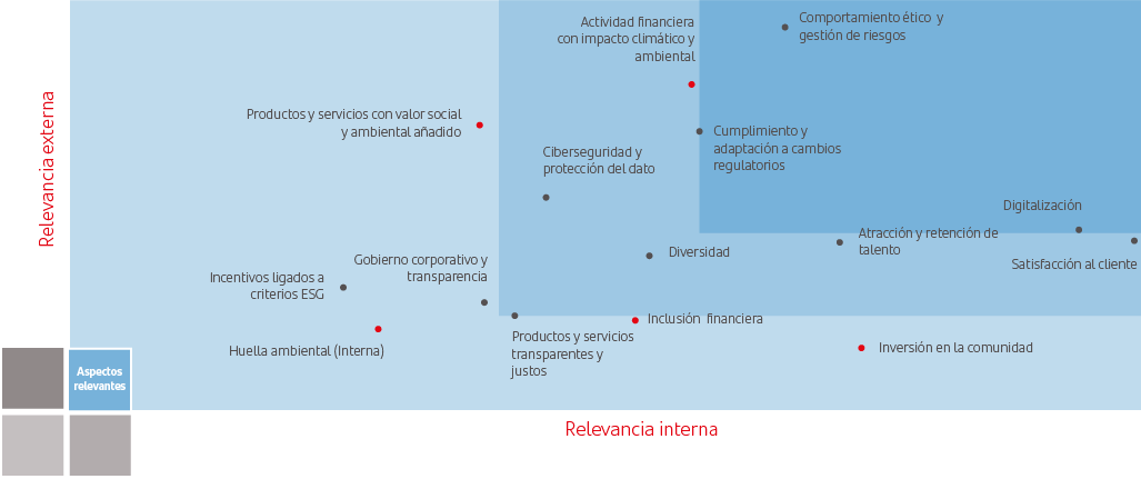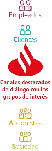 La matriz muestra los aspectos que Santander ha identificado en el análisis como más importantes para sus grupos de interés. En 2019 abordamos muchas de estas cuestiones. En particular, hemos puesto foco en implementar medidas para: potenciar prácticas de negocio responsables; apoyar la transición de la economía ante los retos del cambio climático; y para crear un equipo de profesionales diversos y preparados.