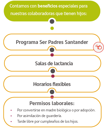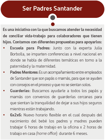 Uno de nuestros pilares de diversidad e inclusión es la conciliación vida-trabajo. Entendemos que el aspecto laboral compone solo una parte de la vida de las personas, por tanto contamos con iniciativas de flexibilidad laboral. Un ejemplo de estas iniciativas es el programa Ser Padres Santander el cual, a través de diversas acciones, busca brindar a nuestros colaboradores el tiempo y la invaluable oportunidad de vivir momentos únicos e irrepetibles con sus hijos, estar presentes en su formación y compartir tiempo de calidad con su familia.