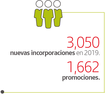 Mediante un plan de carrera que impulsa su crecimiento, en Santander promovemos un sentido de identidad y pertenencia de nuestros colaboradores. Durante 2019 hubo 1,662 promociones o ascensos en distintas posiciones entre nuestro personal, de los cuales 916 correspondieron a mujeres y 746 a hombres.