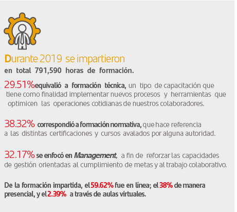 Buscamos profesionalizar y brindar nuevas y mejores herramientas para potencializar el talento con el que contamos. En el ejercicio 2019 se impartieron más de 650 cursos de capacitación en temas diversos: administrativos, comerciales, financieros, éticos, tecnológicos y de seguridad, entre muchos otros.