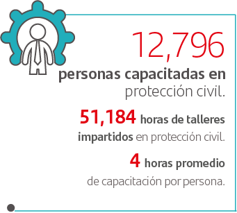 Reforzamos el programa de capacitación práctica que consiste en impartir en cada lugar de trabajo un taller con los principales temas en materia de protección civil para que el personal conozca y ubique posibles riesgos, el material y equipo con el que cuenta para atender situaciones de emergencia y la infraestructura instalada para coadyuvar en situaciones de crisis.