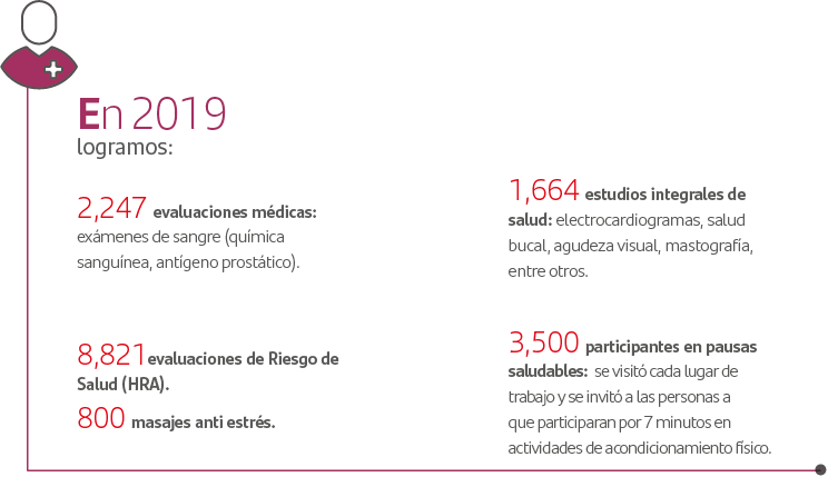 Una de nuestras iniciativas más importantes para la salud es la semana BeHealthy, en la que se realizan diversas actividades para nuestra comunidad. Se organiza un circuito de bienestar para que los empleados conozcan varios temas de salud. A nivel nacional se realizan retos, conferencias, masajes anti estrés, y para la red de sucursales, una Brigada de Salud. Las evaluaciones médicas en sitio incluyen: mastografía, química de 3 elementos, antígeno prostático, electrocardiograma, prueba de agudeza visual, densitometría, espirómetro, insuficiencia venosa, medición de masa corporal, ultrasonido de hígado, fisioterapia, odontología y diagnóstico de estrés.