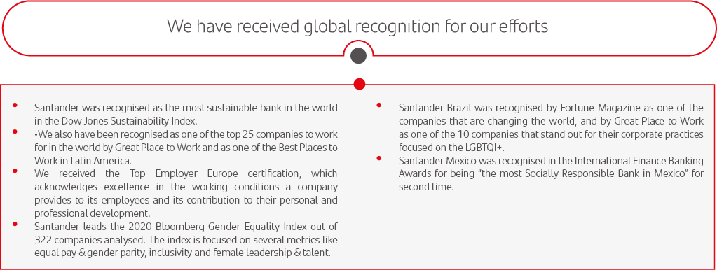 The Corporate Culture Policy has incorporated the Volunteering Policy. We have also updated our Diversity & Inclusion principles to reflect our commitment to people with disabilities and different sexual orientations; and to highlight the importance of having appropriate, accessible products for all. Our Leadership Commitments have been included under our Santander Way minimum standards.