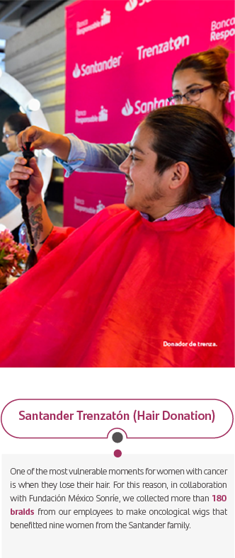 The great solidarity generated by the cause allowed us, in just three weeks, to triple the initial goal of 50 braids and benefit 9 women from the Santander family. This was possible thanks to the participation of 138 donors, men, women and girls, who had their haircut live at our corporate building in Santa Fe, at Contact Center Querétaro or who sent us their braids with messages of strength and encouragement for our beneficiaries.