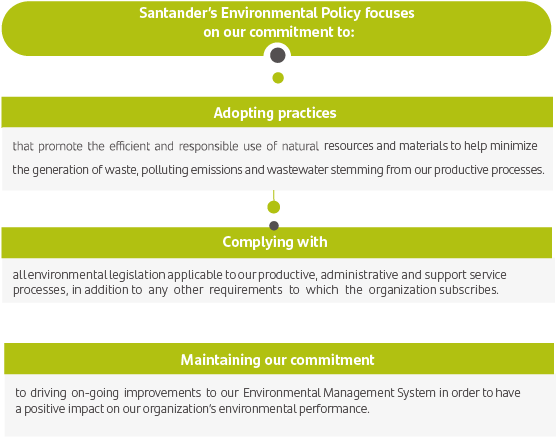 At Santander, we are committed to ensuring that our suppliers share our ethical, legal, social, environmental and economic criteria and values. All suppliers who sign a contract with one of the Group’s entities are responsible for ensuring their organizations have specific processes in place to protect the environment, including: