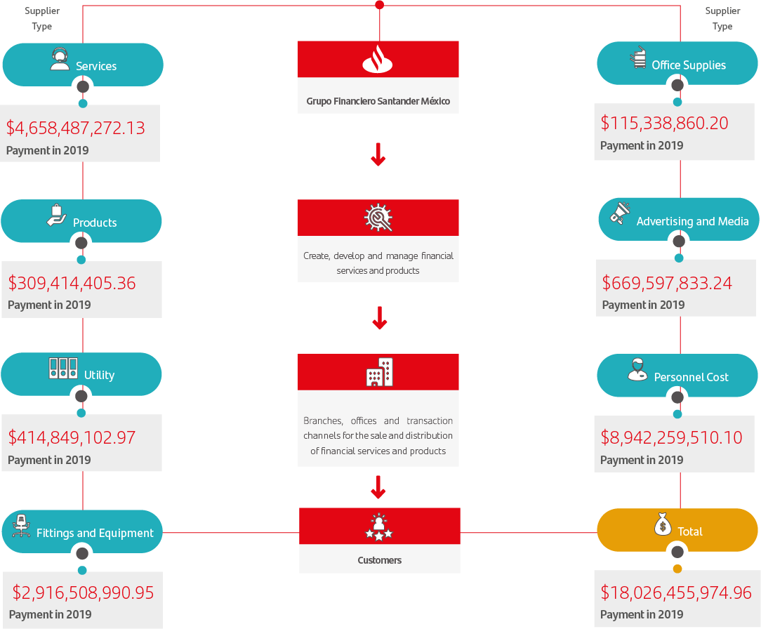 In 2019, we had 4,093 suppliers who offered services valued at MXN $18,026,455,974.96 These include employee benefits and taxes, among other payments made to third parties, which are not included in the supply chain.