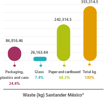 At Santander Mexico, we separate waste from the source to help decrease disposal in landfills. We have achieved this by implementing waste separation campaigns within the institution to help raise awareness among our employees.