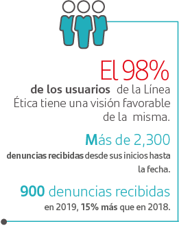 Con nuestra Línea Ética cumplimos con uno de los vectores de la Norma 035 de Factores de riesgo psicosocial en el trabajo y uno de los requisitos del Padrón de Integridad Empresarial por contar con un sistema de denuncias de este tipo.
