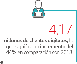 En 2019 llegamos a 4,171,012 clientes digitales, lo que representa alrededor del 23% del total de nuestros clientes activos. En los últimos años este crecimiento ha sido acelerado y en comparación con 2018, aumentó en un 44%.