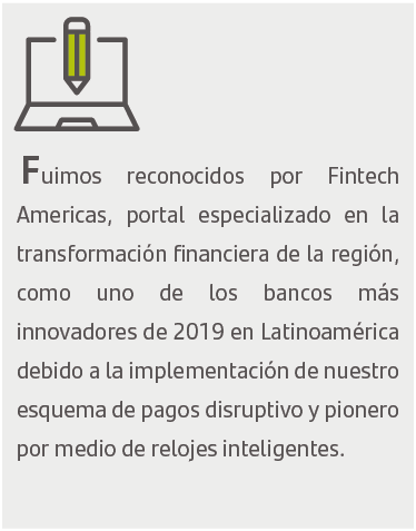 En 2019 hubo grandes avances en materia de Innovación. Creamos un ecosistema de pagos digitales único, impulsando nuevos negocios para el Banco y ofreciendo a nuestros clientes nuevas formas de interactuar con su cuenta y con otros usuarios de la banca.